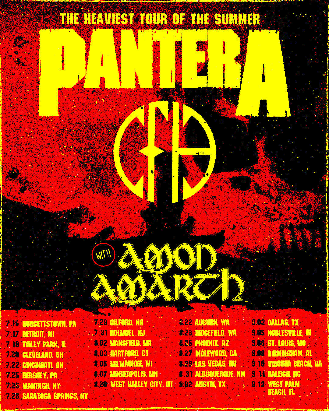 Heavy metal legends PANTERA are pleased to announce their 2025 US Summer amphitheater tour! Produced by Live Nation, the journey will commence on July 15th in Burgettstown, Pennsylvania and wind its way through over two dozen cities, coming to a close on September 13th in West Palm Beach, Florida. Support will be provided by Swedish heavy metal icons Amon Amarth and an additional guest opener to be announced at a later date. Get ready for The Heaviest Tour Of The Summer!